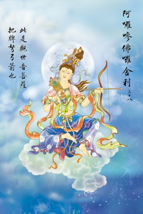 (Chính là bản thân của ngài Quán Thế Âm Bồ tát hiện tướng ngài Quán Thế Âm Bồ tát tay cầm khiên, tay cầm cung tên, kính tụng thần chú, đắc pháp tự tại.)