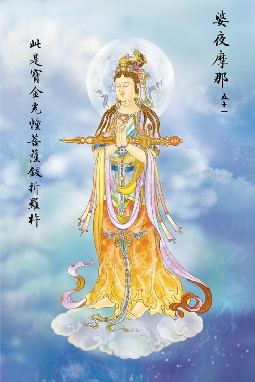 (Chính là bản thân của ngài Quán Thế Âm Bồ tát hiện tướng ngài Bảo Kim Quang Tràng Bồ tát tay cầm Kim Cang Xử lợi ích độ sanh.)