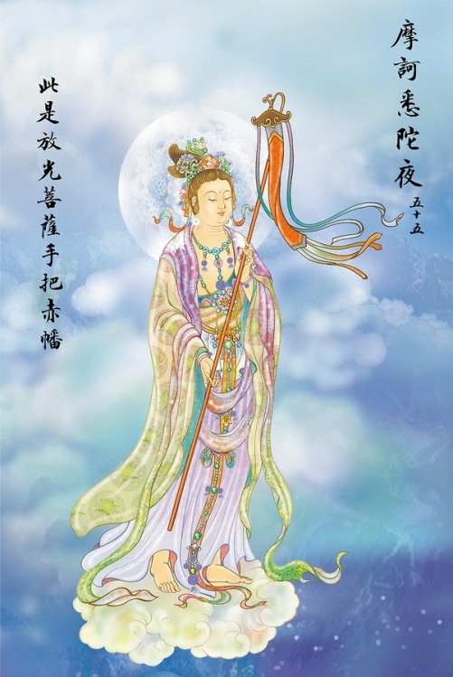 (Chính là bản thân của ngài Quán Thế Âm Bồ tát hiện tướng ngài Phong Quang Bồ tát tay cầm cây tràng phan báu (phướng đỏ) lợi ích độ sanh.)