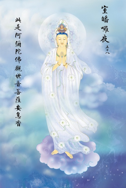 (Chính là bản thân của ngài Quán Thế Âm Bồ tát hiện tướng Thiên Nữ Tự Tại viên mãn tu pháp An tức hương. Đây là An-Tức Hương của Đức A Di Đà và Quán Thế Âm.)