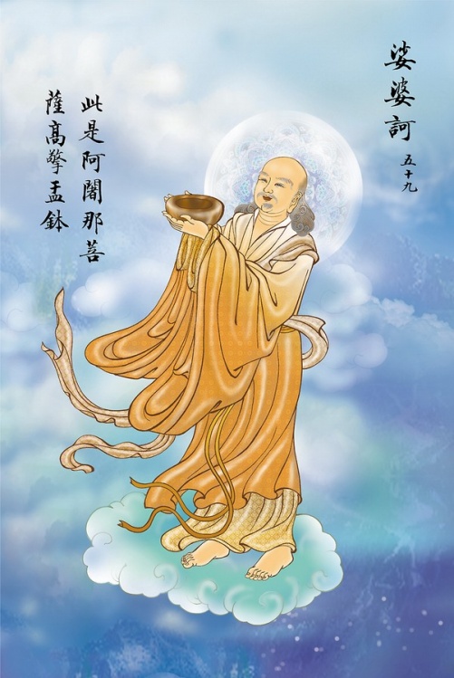 (Chính là bản thân của ngài Quán Thế Âm Bồ tát hiện tướng tôn giả A Xà Na Bồ tát hoan hỷ bưng cao bình bát tăng trưởng tâm lợi ích độ sanh.)