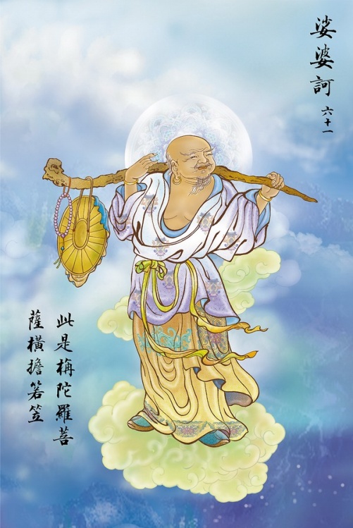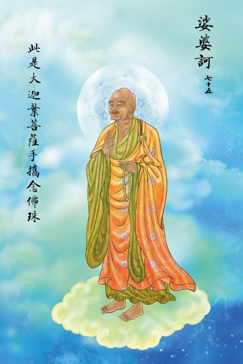 (Chính là bản thân của ngài Quán Thế Âm Bồ tát hiện tướng tôn giả Đại Ca Diếp tay cầm chuỗi và tay cầm thiền trượng chỉ dẫn chúng sanh tu hành.)