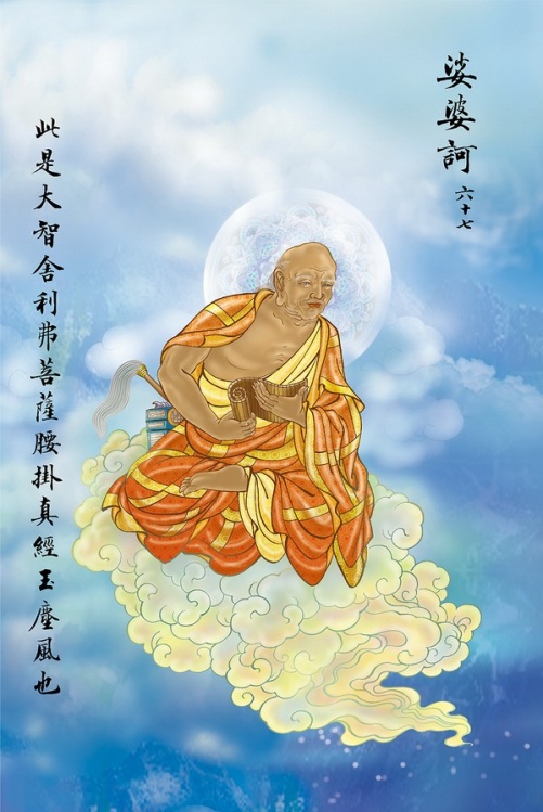 (Chính là bản thân của ngài Quán Thế Âm Bồ tát hiện tướng tôn giả Đại Trí Xá Lợi Phất tay phất trần ngọc, lưng mang chơn kinh cứu cánh thắng nghĩa hóa đạo chúng sanh quy Tịnh Độ.)