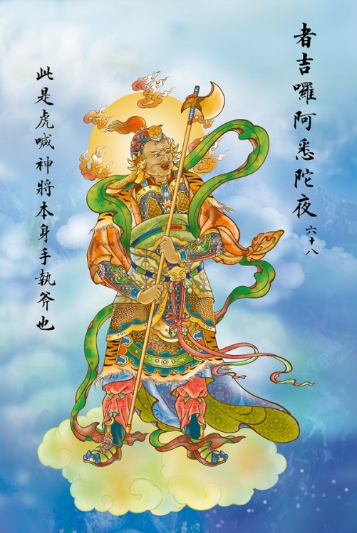 (Chính là bản thân của ngài Quán Thế Âm Bồ tát hiện tướng Thần Hổ Gầm (Kiếu Hám Thần Tướng) tay cầm búa kiên định tâm hàng phục ma oán.)