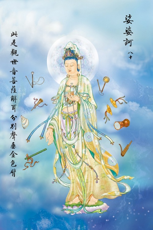 (Chính là bản thân của ngài Quán Thế Âm Bồ tát hiện tướng ngài Quán Thế Âm Bồ tát buông thỏng hai tay, duổi mở hai bàn tay vàng, hiểu lý “tai phân biệt tiếng”, giải trừ nhĩ căn phân biệt thanh trần hư vọng, nghe tự tánh không.)